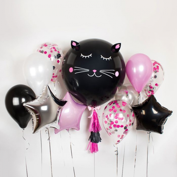 шар латексный 65 см с гелием чёрный с оформлением (наклейки, ушки, кисти тассел) - 1 шт