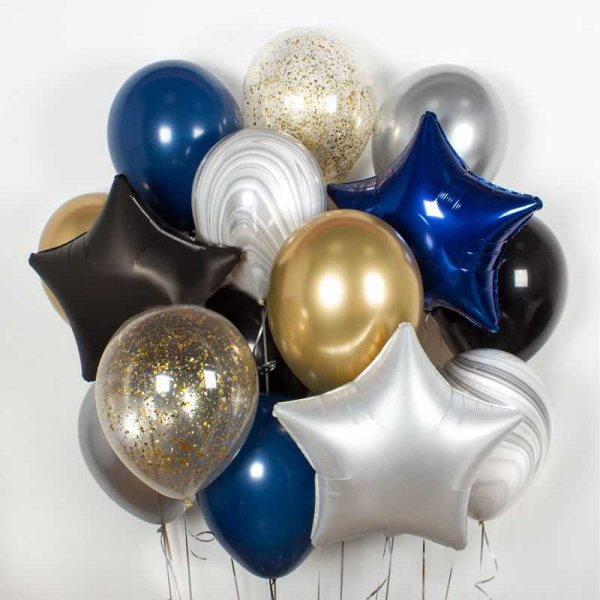 шары фольгированные звёзды синие металлик, черные и серебро сатин с гелием - 3 шт