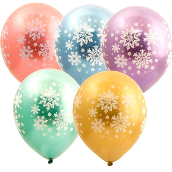 Шар латексный 35 см с эффектом хром с изображением снежинок. Цвета ассорти. С гелием